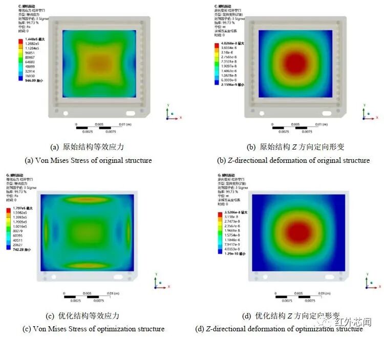 3)500g半正弦波冲击振动环境分析过程中,优化前后Z方向各组件形变最大,且优化后各组件受到的应力指标都在允许范围内。校核发现红外窗口的安全裕度M.S.=30,完全满足可靠性要求。