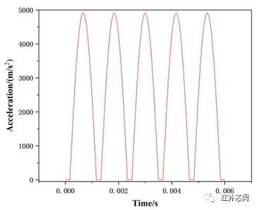 参照国家军用标准,对优化前后非制冷红外探测器的陶瓷封装形式进行了两种最常见的结构动力学可靠性分析——随机振动分析和半正弦波分析。随机振动分析使用加速度功率谱,频率范围从20Hz到2000Hz,加速度的总均方根10.2G,G代表加速度总均方根值,如图3所示。半正弦波分析峰值500g,持续时间1ms,三轴六向,每个方向冲击5次,波形函数,如图4所示。