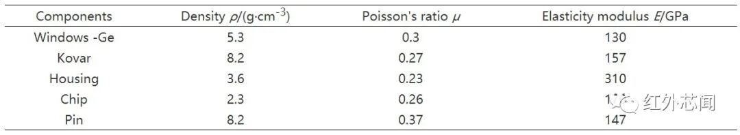 传统非制冷红外探测器的陶瓷封装形式主要由红外窗口、可伐框、吸气剂、管壳、芯片和引脚组件构成。图1展示了某款陶瓷封装形式的非制冷红外探测器的原始结构,本文针对该款结构进行了优化,采用薄膜吸气剂方案,取消可伐框,使整个探测器的制作成本降低了约5%;同时,由于片状吸气剂的取消,整体探测器的宽度由22mm缩减为19mm,可伐框的取消使探测器的高度由8.03mm缩减为6.45mm,体积整体减小约30%,优化后结构如图2所示。由于可伐框主要在红外窗口与管壳之间起缓冲作用,可以提升红外窗口耐受振动和机械冲击的能力,结构优化后的陶瓷封装形式应着重研究产品的可靠性。本文基于ANSYS Workbench建立三维有限元模型进行可靠性仿真,对比分析了原始结构、优化结构在随机振动和随时间变化的载荷冲击过程中形变和受力的情况。