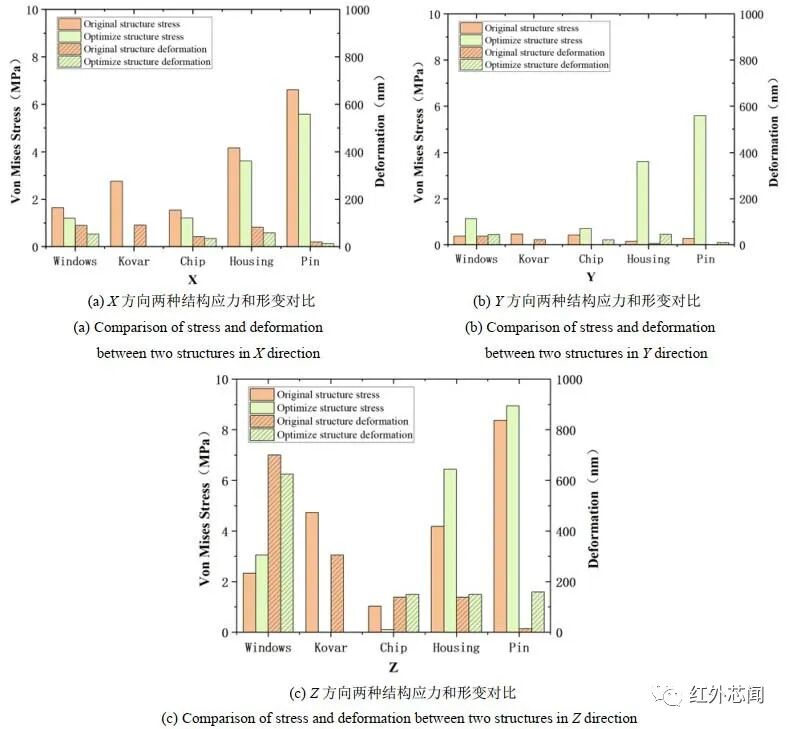 采用模态叠加法,验证了非制冷红外探测器陶瓷封装两种结构在承受国军标要求的500g半正弦波冲击振动环境后的影响。如图6(a)、(b)、(c)所示,探测器各组件在X、Y、Z三个方向上最大等效应力和最大形变均发生在Z方向上。考虑到红外窗口是探测器最容易失效的组件,红外窗口受到最大等效应力为3.05MPa,远小于红外窗口的屈服极限115MPa。