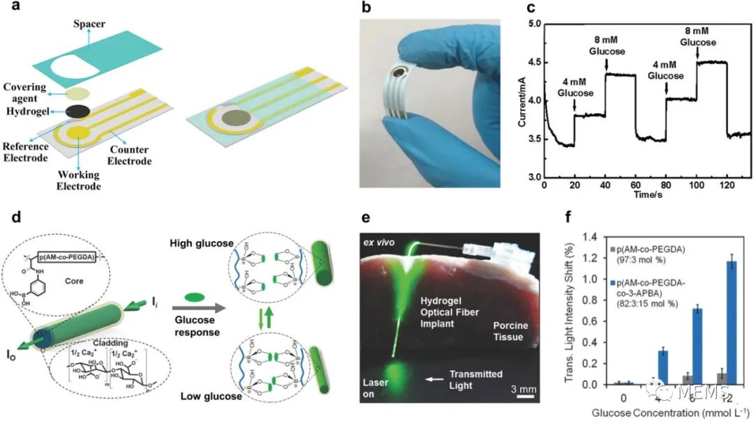 图8 由功能性水凝胶制成的柔性、可弯曲葡萄糖传感器