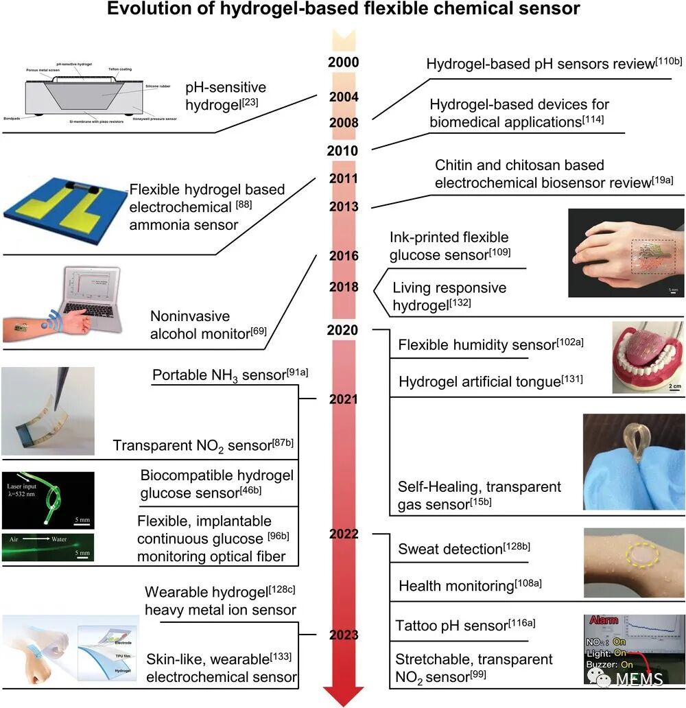图1 在过去的二十年中,基于功能性水凝胶的柔性化学传感器的代表性示例