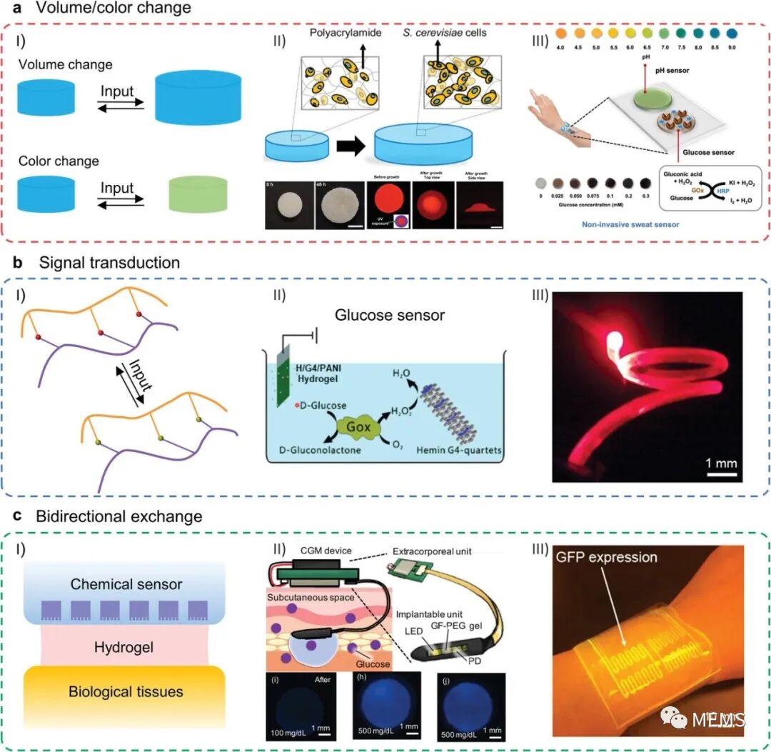 杂化水凝胶既能保持其自身的特性,又能与其它成分协同作用。常见的功能材料包括纳米颗粒、聚合物、生物分子(如酶和DNA)和其它添加剂。当暴露于外部刺激时,传感材料会发生物理/化学变化,从而调节聚合物链和分析物之间的相互作用。
