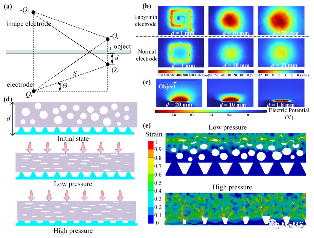 该传感器的结构如图1所示,它由三层组成:顶层和底层是带有迷宫式铜电极的PET,顶层和底层电极之间夹着一层硅橡胶电介质层,具有多孔-截断金字塔双层微结构。传感器分为12个传感单元,每个传感器单元由一对互补的迷宫电极和一个多孔-截顶金字塔分层电介质组成。通过将电极设计成方形迷宫结构加强边缘电场,从而提高近距离感知性能。多孔-截断金字塔分层电介质层的设计旨在通过分层变形来改善硅橡胶的变形能力,从而提高压力传感性能。
