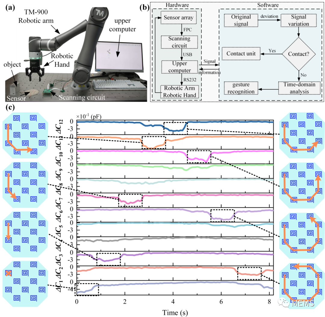 为了验证我们开发的双模传感器在人机交互中的潜在应用,我们进行了机器人交互实验。如图4(a)和图4(b)所示,我们搭建了一个人机交互平台。传感器通过FPC连接到采集电路。MCU通过控制模拟开关选择传感器单元。选定传感器单元的行电极和列电极随后连接到AD7153 CDC芯片,该芯片通过在方波激励期间连续采样通过传感器的电荷来收集电容数据。然后通过USB将数据传输到控制机械臂的计算机,计算机根据收集到的数据识别交互动作,然后通过 RS232将控制命令传输给机械臂和机械手。