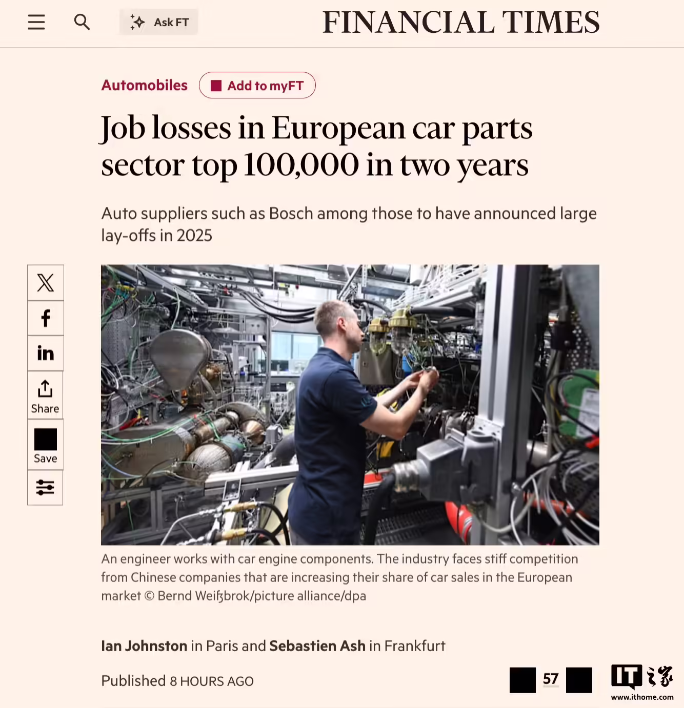 1 月 14 日消息,当地时间 1 月 13 日,据英国《金融时报》报道,欧洲汽车零部件行业的裁员潮仍在扩大。